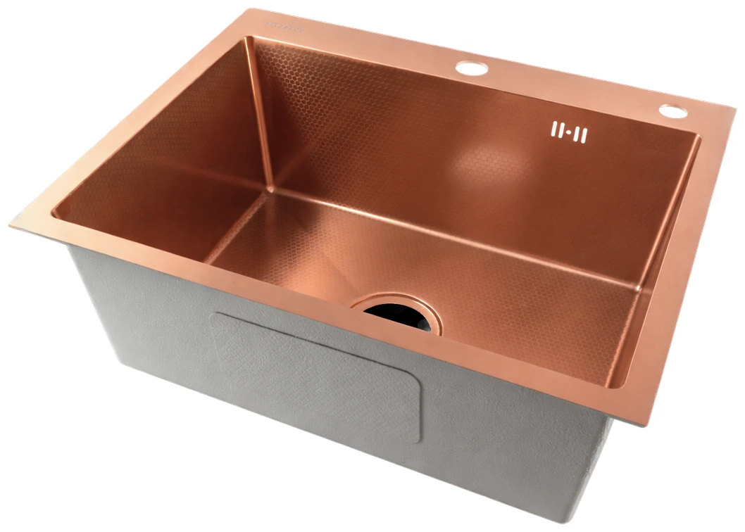 Мойка имеет декоративное PVD-покрытие с нано-сотовой текстурой, которое делает поверхность визуально выразительной и более удобной в повседневной эксплуатации: